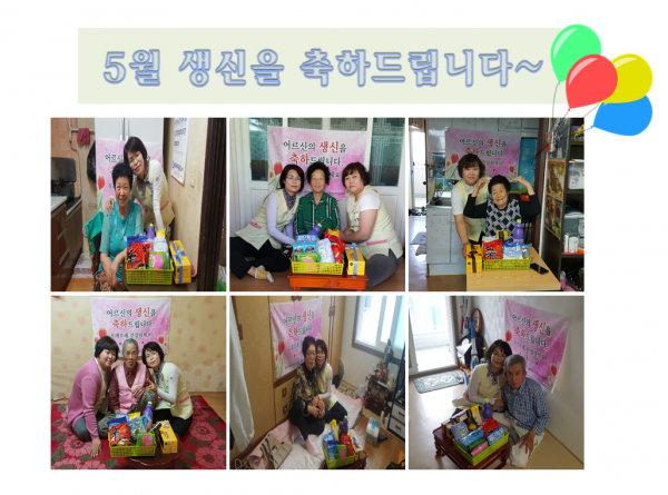 ❑ 내 용: 5월 생신을 맞이한 여러 어르신을 찾아뵙고 생신을 축하해 드렸습니다. 롤케익과 어르신들이