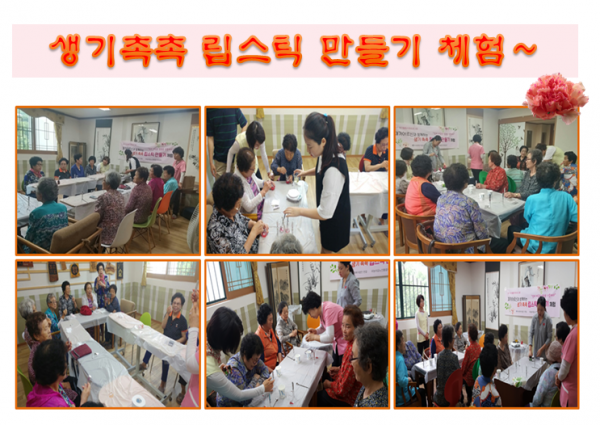 ❑ 내 용: 6월의 문화체험에는 재가어르신30명을 모시고 진주요양원 2층 가족면회실에서 천연립스틱 만들기