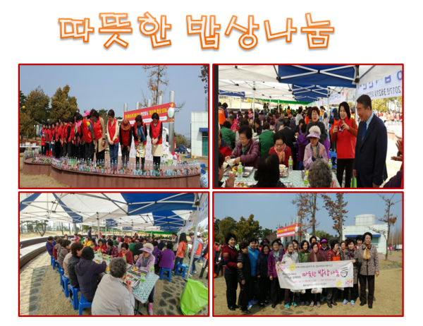 경상남도자원봉사센터운영 경남여성리더봉사단 준비의 “사랑의 밥차 중식나눔” 행사에 재가어르신24명을 모시고 화기애애한 분위기속에서 정성스럽게 준비한 점심식사를 제공받음. 돌아가실때 작은 화분 1개와 전통과자 한봉지 씩 제공받음으로써 따뜻한 사랑과 정을 나누는 소통의 시간이 되었음.