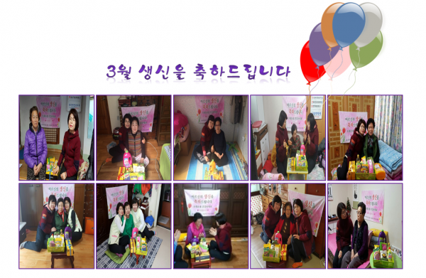 ❑ 내 용: 3월에는 10분의 어르신을 찾아가 생신을 축하해 드렸습니다. 롤케이크와 선물세트 등의 생신축