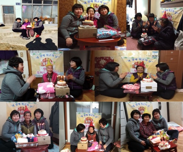 * 내 용 : 1월 생신을 맞으신 8분의 어르신들과 함께 생신서비스 진행하였습니다. 재가노인지원서비스 대상자로 선정된 후 처음으로 생신서비스를 제공받은 김0숙 어르신은 아주 좋아하셨습니다. 선물은 생활에 필요한 물건들로 적절하게 제공하여 아주 반응이 좋았습니다.