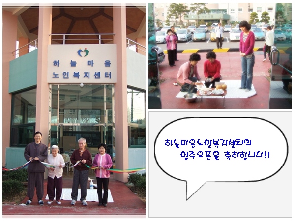 하늘마음 노인복지센터 입주오픈커팅!!! 페이지 정보 작성자 웹마스터 댓글 0건 조회 5,897회 작성일 08-04-04 19:58 목록 본문 그동안 요양원내의 사무실에서 업무를 보던 재가센터가 신축한 요양원 단지내의 아름다운 팔각정에 새봄맞이 단장을 한 후 관내 어르신의 바램과 함께 소담한 입주식을 갖고 힘찬 도약의 날개짓을 시작했답니다. 화이팅~~!!! 추천412
