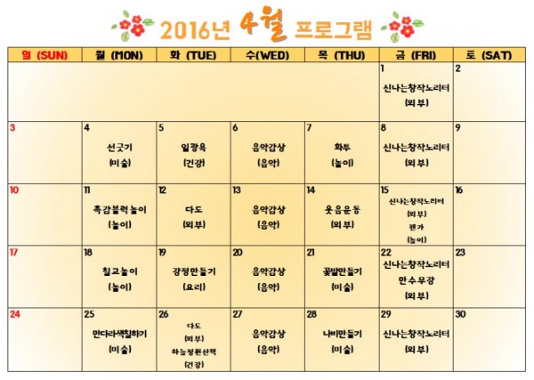 봄바람이 살랑살랑, 꽃내음이 솔솔~ - 2016년 4월 프로그램 일정 페이지 정보 작성자 웹마스터 댓글 0건 조회 2,824회 작성일 16-03-31 19:44 목록 본문 봄바람이 살랑살랑, 꽃내음이 솔솔 불어오는 봄을 맞이하여 우리 진주요양원에서 진행되는 4월 프로그램 일정을 소개하겠습니다. 추천167