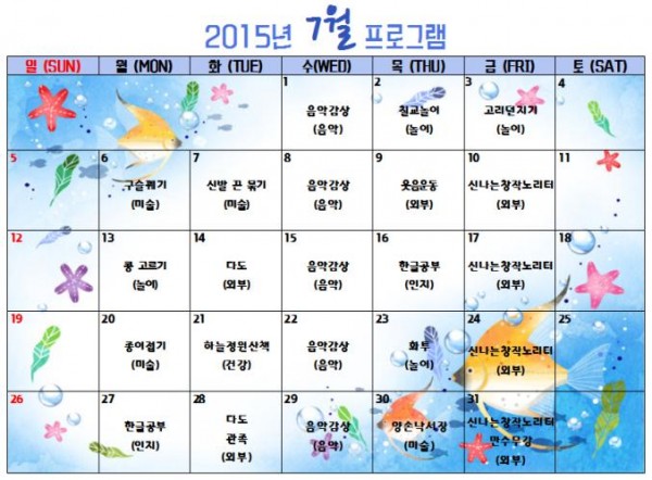 “초여름, 건강에 주의합시다!” - 2015년 7월 프로그램 일정 페이지 정보 작성자 웹마스터 댓글 0건 조회 2,863회 작성일 15-07-01 19:25 목록 본문 초여름, 건강에 주의하시길 바라며 7월동안 우리 진주요양원에서 진행되는 프로그램 일정을 소개하겠습니다. 추천183
