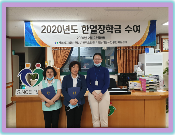 * 2020년도 한얼장학금 수여 페이지 정보 작성자 웹마스터 댓글 0건 조회 4,639회 작성일 20-02-26 17:09 목록 본문 □ 내 용 : 2020년02월25일(화) 사회복지법인 한얼의 목적사업 일환으로 근무직원의 사기진작을 위하여 한얼장학금 전수식을 가졌습니다. - 자격요건 : 법인산하시설 근무경력 2년 이상인 직원 중 2020년도 중,고,대학(원)교에 입학하는 자녀 - 대 상 자 : 대학교입학 하미라선생님의 자 원창훈, 대학원입학 이금옥선생님의 딸 안수지. 추천15