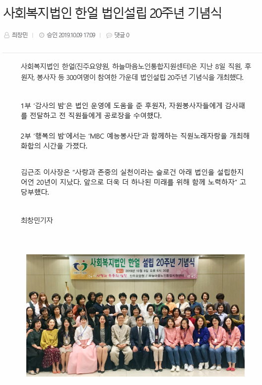 * 사회복지법인 한얼 법인설립 20주년 기념식(경남일보발취) 페이지 정보 작성자 웹마스터 댓글 0건 조회 4,829회 작성일 19-10-10 13:50 목록 본문 출처 : 경남일보(http://www.gnnews.co.kr) 추천75