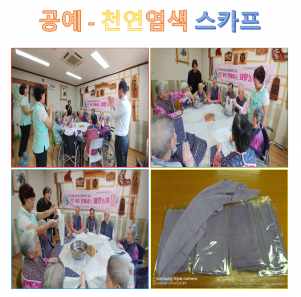 □ 내용 : 신나는 레크리에이션을 시작으로 오늘은 어르신들과 함께 천연소재로 스카프를 염색 해 보는