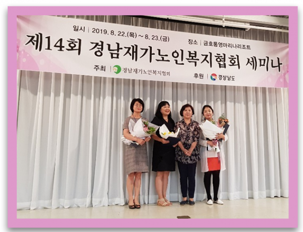 * 2019년 경남재가노인복지협회 세미나 참여 페이지 정보 작성자 웹마스터 댓글 0건 조회 4,244회 작성일 19-08-22 17:16 목록 본문 □ 내용 : 2019년 제14회 경남재가노인복지협회 세미나가 8월22일~23일 양일간 통영 금호마리나 리조트 에서 열렸습니다. 이번 세미나에서는 주미애 요양보호사님께서 사랑하는 마음으로 재가어르신 의 건강하고 행복한 삶에 기여한 공로를 인정받아 한국재가노인복지협회장 상을 수상하셨습니 다. 축하드립니다. 추천101