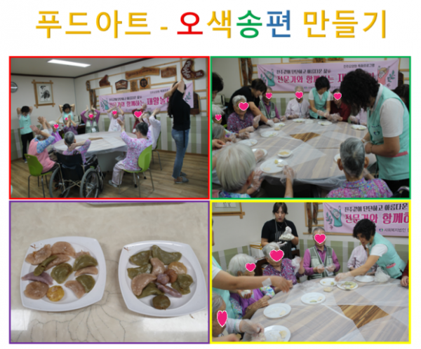 * 특화프로그램(9회차) - 오색송편 만들기 페이지 정보 작성자 웹마스터 댓글 0건 조회 4,606회 작성일 19-09-18 17:31 목록 본문 □ 일시 : 2019년09월18일(수) □ 내용 : 외부 전문 강사님과 함께 추석에 먹는 음식에 대해 알아보고 온 가족이 옹기종기 둘러 앉아 송편을 빚는 옛 추억을 떠올리며 오색 송편을 만들어 보는 시간을 가졌습니다. 어르신들 모두 저마다 의 솜씨를 자랑하시며 다양한 모양의 송편을 만드셨습니다. 추천97