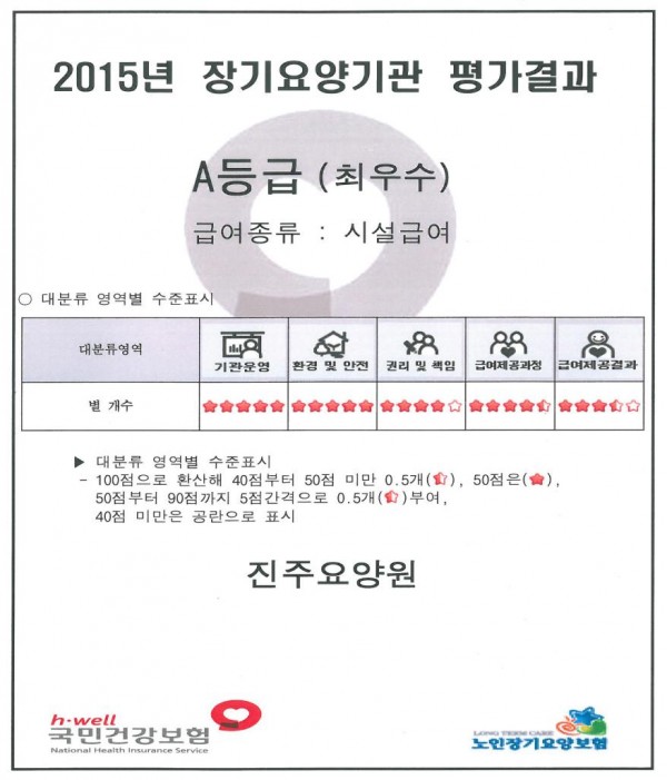 2015년 5월에 있었던 장기요양기관 평가결과 진주요양원은 최우수(A등급)를 받았습니다.