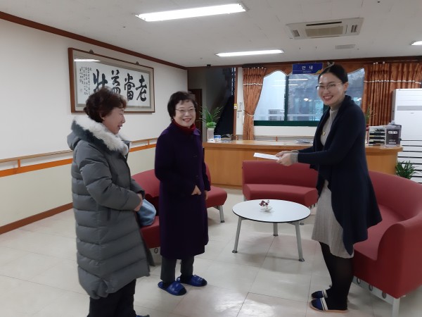 * 일신봉사팀 후원금전달식 페이지 정보 작성자 웹마스터 댓글 0건 조회 4,196회 작성일 19-02-07 12:22 목록 본문 □ 내 용 : 2019년01월31일 일신봉사팀(진주여고총동창회의 소속)의 안옥련총동창회장님, 박혜자 총무님께서는 설명절을 맞아 우리요양원을 방문하여 어르신들을 위한 소중한 후원금을 전달해주셨습니다. 일신봉사팀의 따뜻한 마음에 감사드립니다. 추천98