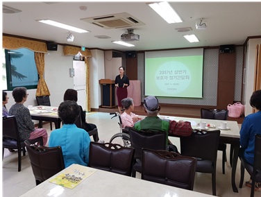 2017년 6월 20일 (화) 오후 2시 진주요양원 강당에서 2017년 상반기 보호자 간담회가 개최 되었습니다. 우리 요양원에서 생활하시는 어르신들의 보호자 분들께서 참석하시어 서비스 제공내역 및 어르신 최근 건강/생활 상황에 대하여 간호사 선생님께 브리핑을 들었습니다. 또한 우리 요양원에서 생활하시면서 개선이 필요했다고 생각되는 부분에 대하여 자유롭게 이야기 나눌 수 있어 뜻깊은 시간 이었습니다.