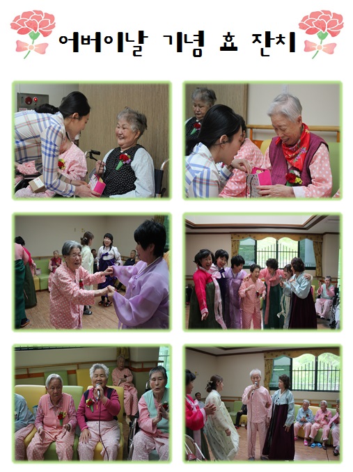 어버이날 기념 효 잔치 페이지 정보 작성자 웹마스터 댓글 0건 조회 4,678회 작성일 17-05-12 16:40 목록 본문 2017년 5월 8일 어버이날을 맞아 요양원 직원들의 정성이 담긴 선물 및 카네이션 전달과 노래자랑 프로그램 실시로 어버이 은혜에 감사하고 어르신을 존경하며 사랑하는 마음을 다시금 되새길 수 있는 뜻 깊은 시간을 가졌습니다. 추천138