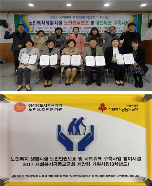 2017년 3월 29일 (수) 경상남도서부권역지역노인보호전문기관(관장 곽준석)과 경남과학기술대학교 산학협력관에서 노인복지 생활시설 노인인권보고 및 네트워크 구축사업의 원활한 업무협조를 위하여 ‘노인인권지킴이단 사업’에 관한 협약을 체결하였습니다. 우리 요양원은 작년에 이어 올해도 노인인권지킴이단 파견 사업에 참여합니다. 생활어르신 권익향상과 시설 내 학대 예방을 위해 최선을 다 하겠습니다.