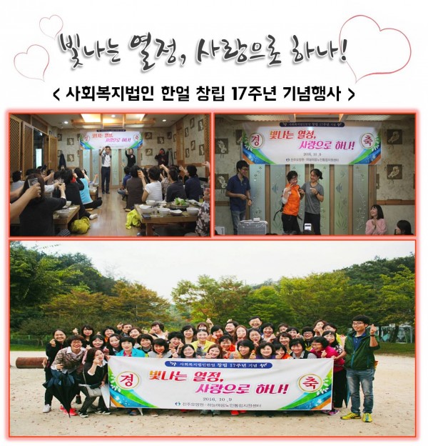 사회복지법인 한얼 창립 17주년 기념행사 ‘빛나는 열정, 사랑으로 하나!’ 페이지 정보 작성자 웹마스터 댓글 0건 조회 4,346회 작성일 16-10-11 16:20 목록 본문 2016년 10월 07일(금) 사회복지법인 한얼 창립 17주년 '빛나는 열정, 사랑으로 하나!' 행사를 실시하였습니다. 직원의 화합과 단합을 위해 금호못에서 즐거운 산책과 흥미진진한 경품행사로 두 손 가득 행복하게 법인행사를 마무리 했습니다. 앞으로도 한얼의 정신을 잊지 않고 어르신들이 더 행복한 삶을 누릴 수 있도록 노력하겠습니다. 추천148