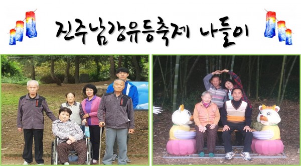 2016년 10월 11일(화), 10월 13일(목) 우리원 어르신들과 최근 성황리에 개최된 진주의 대표 축제인 진주남강유등축제에 참가하여 먹거리 장터, 유등 감상, 부표 건너기 등 다양한 경험을 통해 지역 고유의 특색적인 문화와 축제의 즐거운 분위기를 직접 보고 느꼈습니다. 오랜만의 나들이로 신체 및 심리·정서적으로 쇠약해지고 있는 어르신들에게 삶의 활력을 불어넣고, 고독감, 우울감 등을 해소함으로써 삶의 질을 향상시킬 수 있었던 뜻 깊은 시간이었습니다.