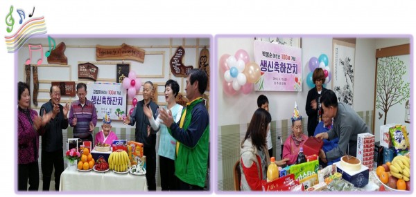 100세 기념 생신잔치 진행 페이지 정보 작성자 웹마스터 댓글 0건 조회 4,364회 작성일 16-04-27 14:41 목록 본문 2016년 4월에는 100세 기념 생신잔치가 두 번이나 진행되어 한 달 내내 잔치분위기로 요양원이 떠들썩하였습니다. 올해 100세를 맞이하는 김점이, 박용순 어르신을 위해 가족들과 어르신 및 직원들이 함께 모여 축하의 노래를 불러드리고, 떡과 과일을 나눠먹으며 장수를 축하하고 건강을 기원 드렸습니다. 어르신! 앞으로도 지금처럼 늘 건강하세요~! 추천165