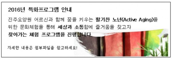 2016년 진주요양원 특화프로그램 안내 페이지 정보 작성자 웹마스터 댓글 0건 조회 4,453회 작성일 16-05-24 14:56 목록 본문 2016년 6월 3일(금)에 진행될 특화프로그램을 안내해드리고자 합니다. 추천198 첨부파일 14642493852.hwp (526.0K) 87회 다운로드 | DATE : 2016-05-24 14:56:07