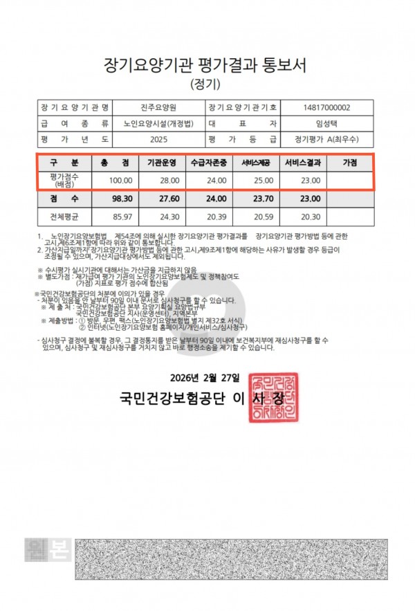 진주요양원, 2025년 장기요양기관평가 최우수 A등급 획득!!